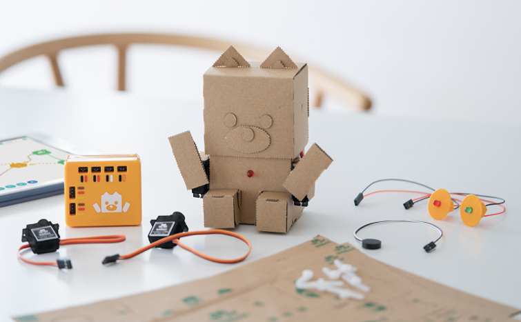 『embot(エムボット)』はダンボールと電子工作パーツを用いてロボットを組み立てることで、電子工作やものづくりの基礎を学ぶことができます。また、タブレット等にインストールした専用アプリを用いて、初心者でも簡単に組み立てたロボットを動かすことができます。一連の作業を通してプログラミングも学ぶことができるサービスです。プログラムをフローチャート形式で組むことができるため、if文やfor文など、より高度なプログラミング要素も養うことが可能です。