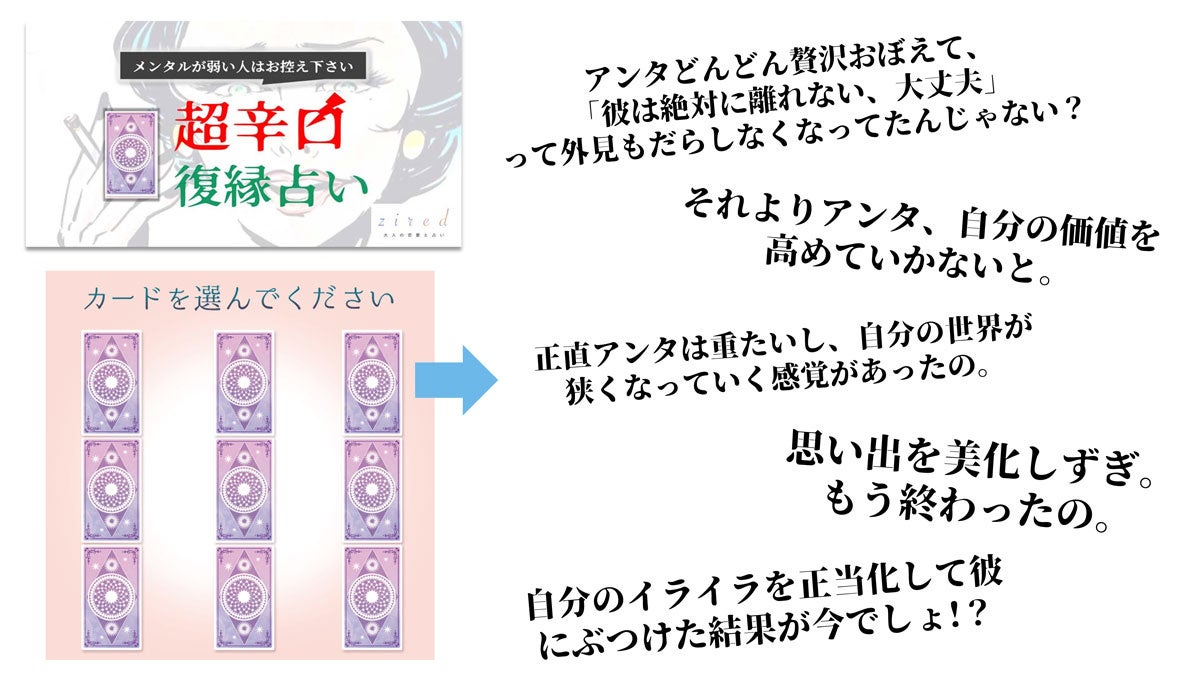 利用者は、タロット占いによって出たカードが暗示する「今後の復縁恋愛の行方」や「あなたと彼の関係や可能性」などを【超辛口】の鑑定文を通して知ることができます。