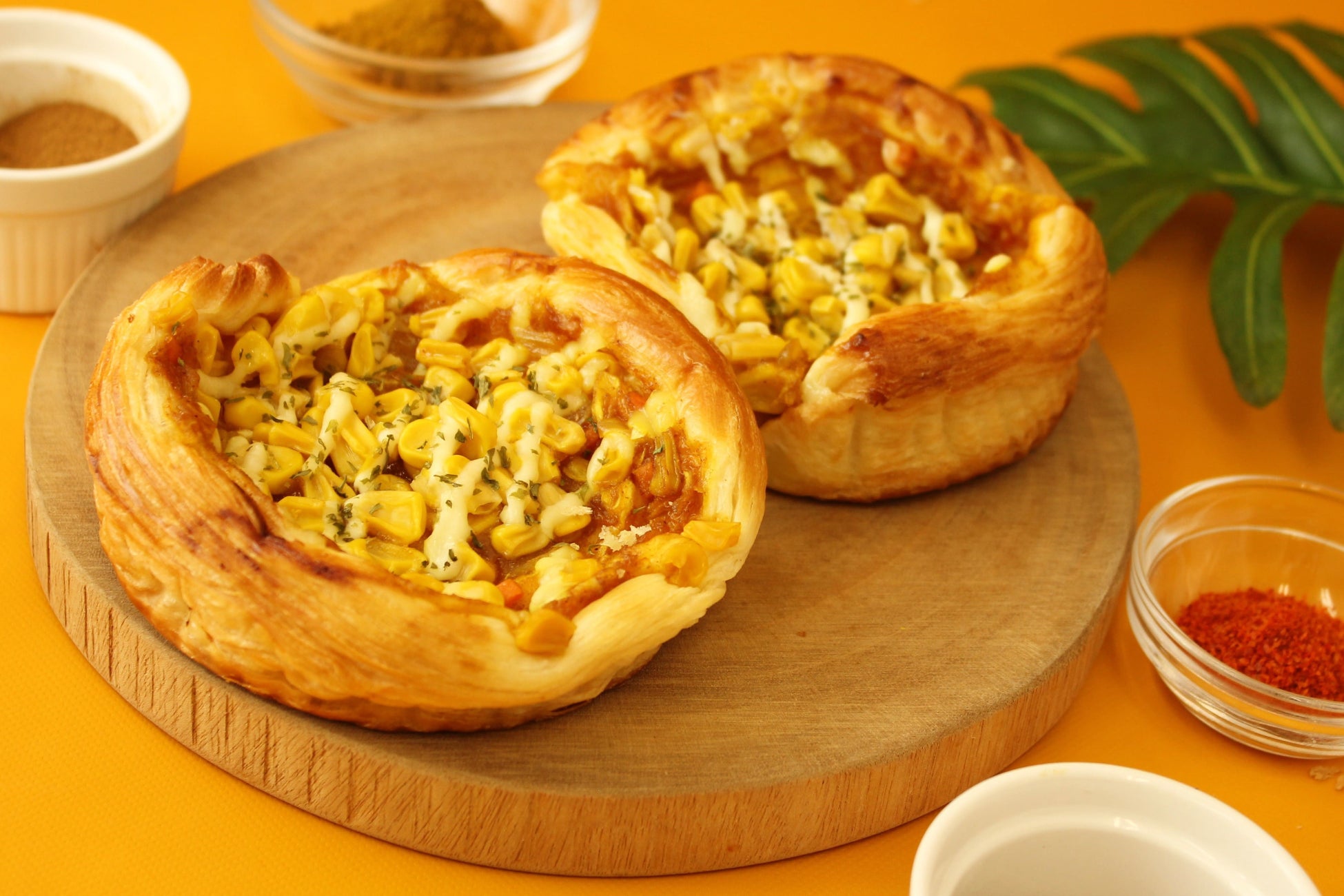 キャベツ、たまねぎ、にんじんを使用したカレー味のフィリングに、たっぷりのコーンをトッピング。歯触りの良い野菜のシャキシャキ食感を楽しめる軽やかなデニッシュです。