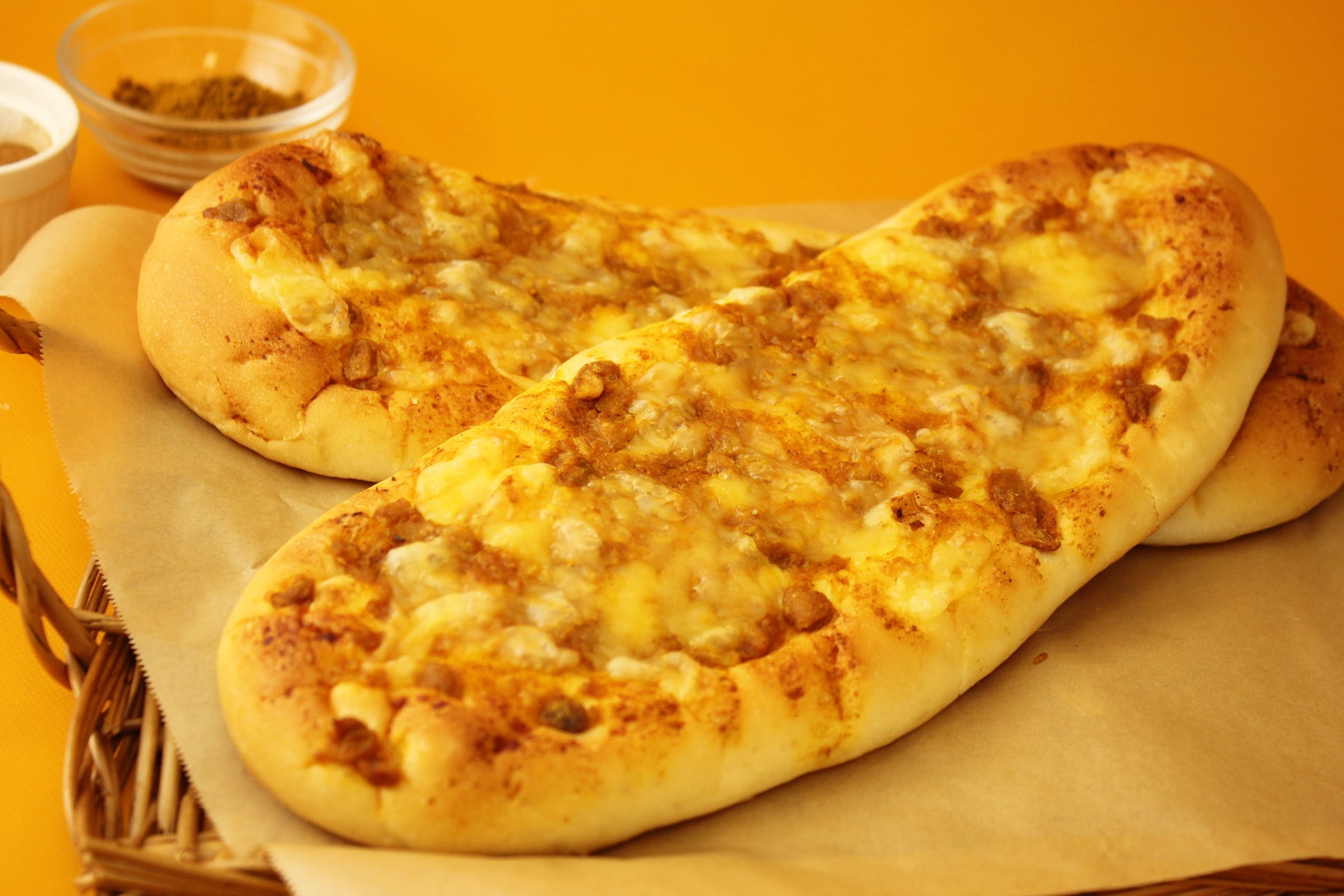 ナンに見立てて大きく伸ばした生地に、さわやかな酸味とマイルドなコクのあるタンドリーチキン風のカレーフィリングを塗り、チーズをのせて焼き上げました。全長約25㎝の大きさにびっくり!