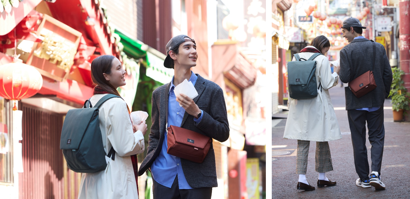 S サイズは貴重品や文庫本、ペットボトルなどおでかけのマストアイテムがすっきり収まるサイズ感。たっぷり大容量の L サイズ は直接メイン収納にアクセスできる背面ファスナー付き。IC カードなどが収納できるフラップ裏のポケットや、小物の収納に便利 なフロントポケットなど持ちやすさにこだわったディテール。
