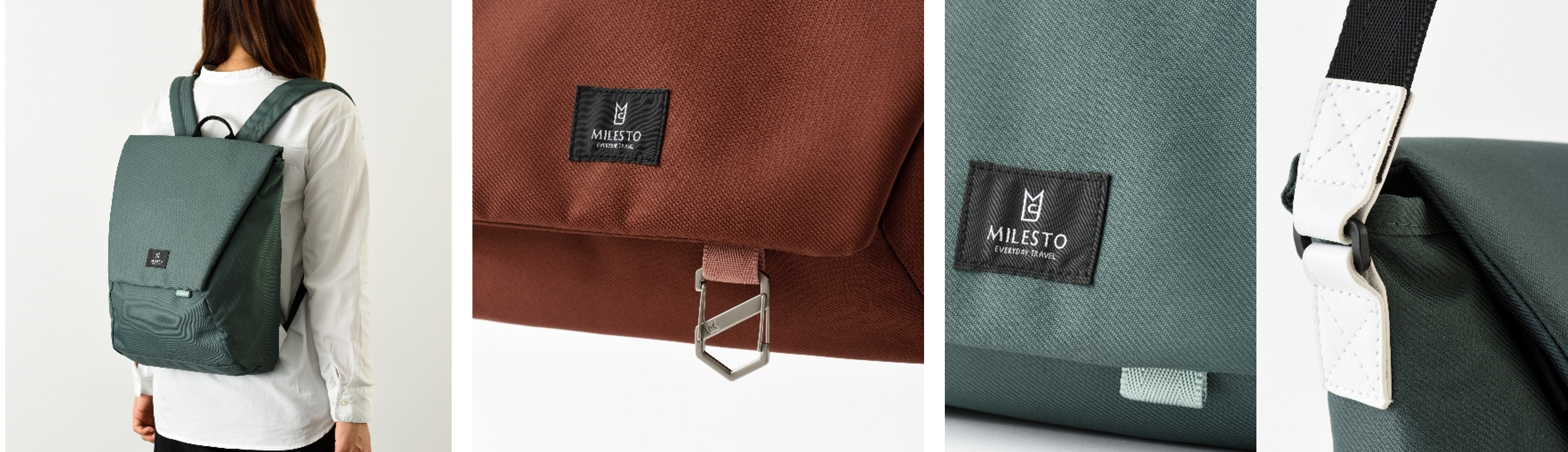 ※左からバックパックの着用イメージ、フラップに付属したループのイメージ(カラビナは別売り)、コーデュラ生地と防水カラーレザーのイメージ