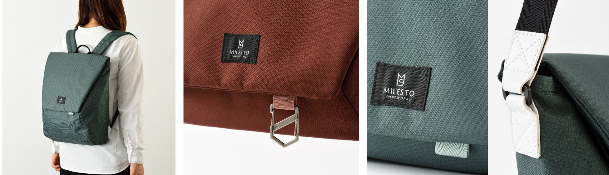 ※左からバックパック(ダークグリーン)、メッセンジャーS(テラコッタ)、メッセンジャーL(ダークグリーン)