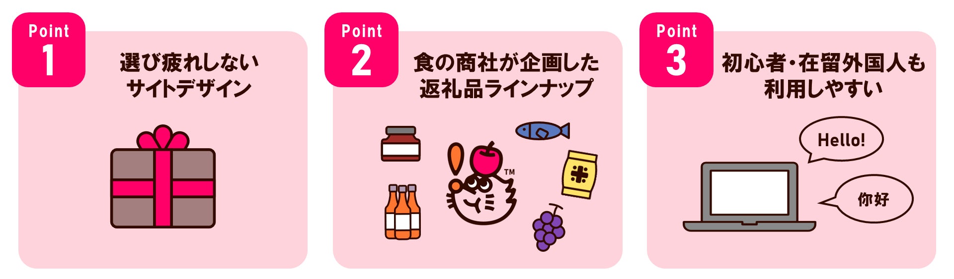 3)初めての方が始めやすい少額の寄附、単身者向けの少量の食品をご用意しています。また在留外国人の方も利用しやすいよう、英語・中国語(※5)に対応した、サイト翻訳機能、おすすめの返礼品特集のほか、オペレーションセンター(※6)を開設予定です。