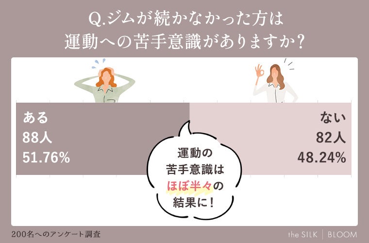 その中でもジムが続かなかった経験があるかを193名の女性たちに調査したところ、なんと86%もの割合で「続かなかったことがある」と回答しました。