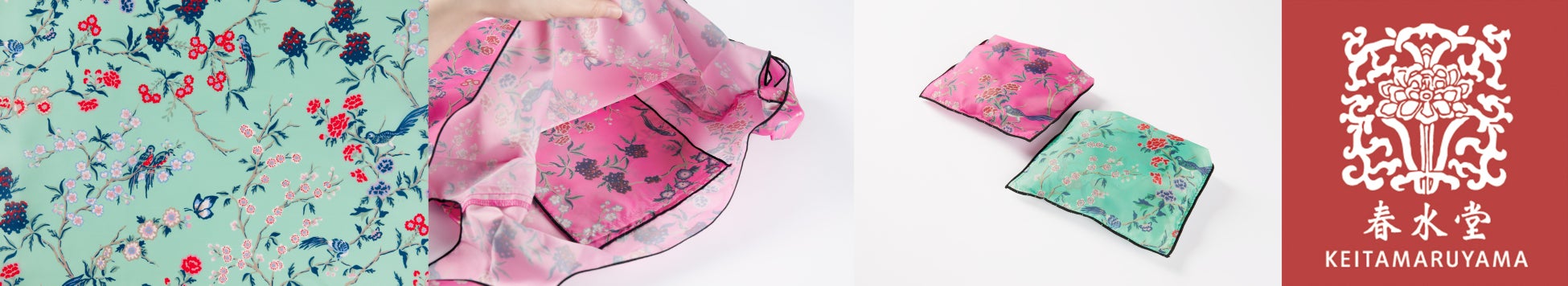 コラボグッズの目玉となるのは、春水堂のブランドイメージにぴったりのオリエンタルなデザインの美しい2種のオリジナルエコバッグ(各2,200円 税込)です。カラーは爽やかなミントグリーンとキュートなピンクの2色。全面プリントされた華やかな花鳥のイラストが気分を盛り上げてくれます。