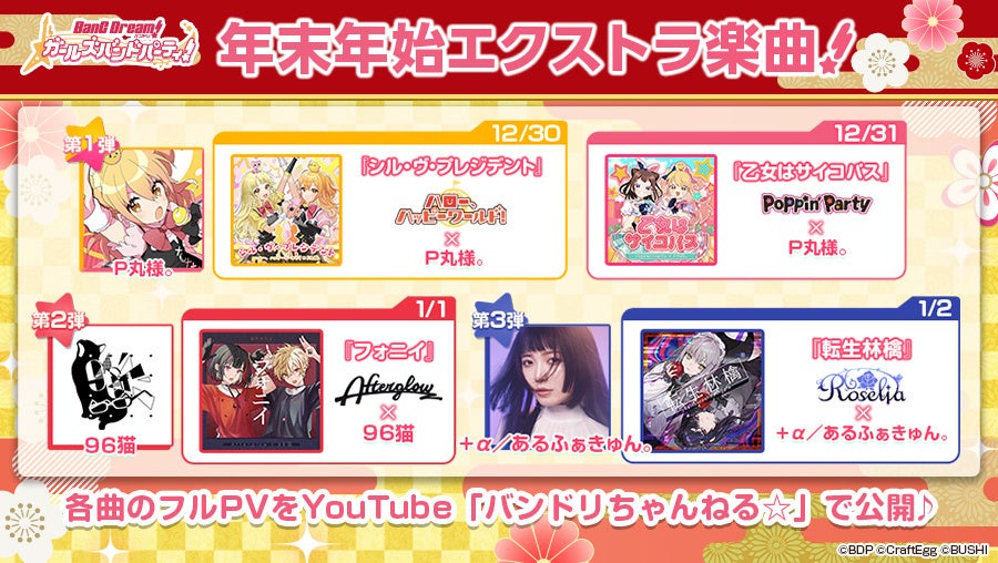 株式会社Craft Egg(本社:東京都渋谷区 代表取締役:森川 修一、以下、Craft Egg)と、株式会社ブシロード(本社:東京都中野区 代表取締役社長:木谷高明、以下、ブシロード)の共同制作によるスマホゲーム「バンドリ! ガールズバンドパーティ!」(以下、ガルパ)は、年末年始エクストラ楽曲として、第1弾『シル・ヴ・プレジデント』(ハロー、ハッピーワールド!×P丸様。)『乙女はサイコパス』(Poppin'Party×P丸様。)、第2弾『フォニイ』(Afterglow×96猫)を追加したほか、2023年1月2日(月)より、第3弾『転生林檎』(Roselia×+α/あるふぁきゅん。)をゲーム内に追加いたします。