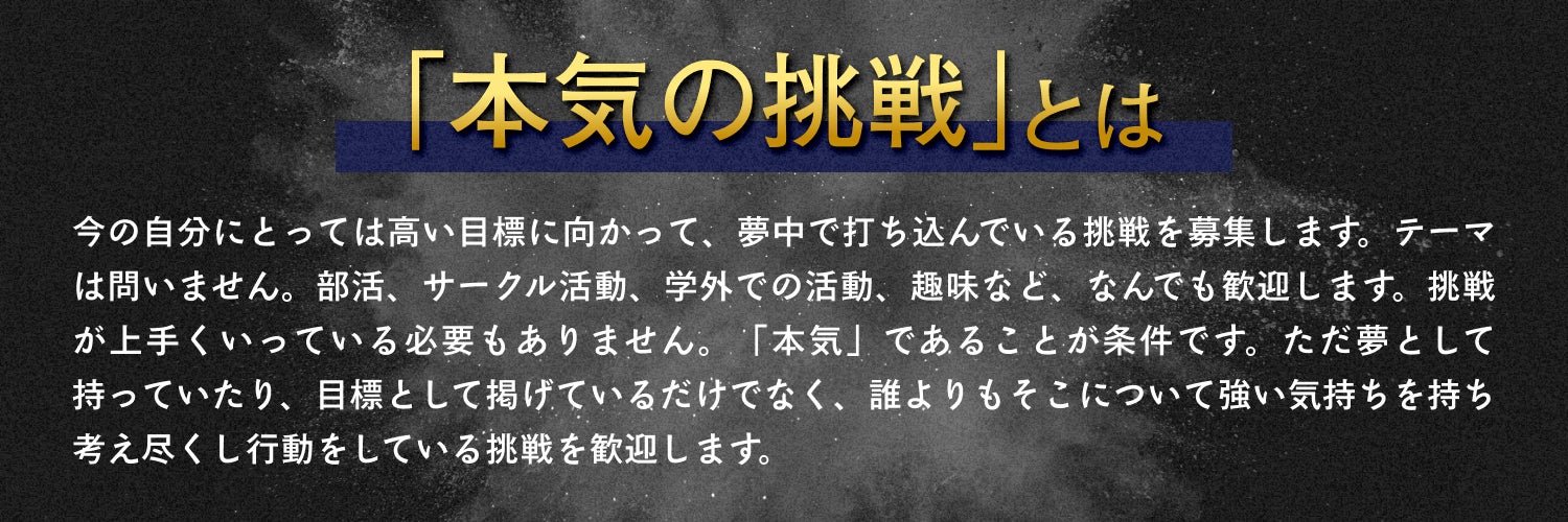 「本気の挑戦」とは、今の自分にとって高い目標に向かって夢中で打ち込んでいる挑戦であり、テーマは問いません。部活、サークル活動、学外での活動、趣味など、どんな挑戦も歓迎します。「本気」であることが条件で、挑戦が上手くいっているかどうかは問いません。