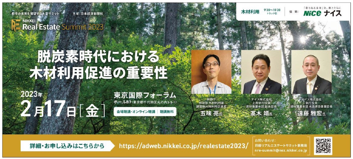 ナイス株式会社(本社:横浜市鶴見区、社長:杉田 理之)は、2月17日に東京国際フォーラムで開催される都市の未来を展望する大型サミット「NIKKEI Real Estate Summit2023」(主催:日本経済新聞社)にて、上席執行役員 資材事業本部副本部長の髙木 靖並びに執行役員 資材事業本部木造建設事業部長の遠藤 雅宏が登壇し、林野庁 林政部木材利用課 建築物木材利用促進官の五味 亮氏とともに、「脱炭素時代における木材利用促進の重要性」をテーマに講演を行いますので、お知らせいたします。
