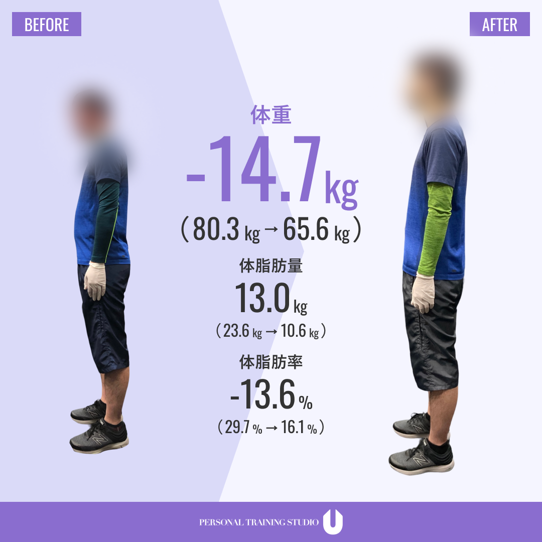 パーソナルジムの多くは週2回通うことを推奨しますが、PERSONAL TRAINING STUDIO Uでは週1回50分で目標達成に導く指導を提供しております。多くのお客様がジムに通っていたが、通うことが辛くなり挫折してしまったという方が当スタジオに通われております。丁寧なお客様にあったトレーニング指導と無理のないオーダーメイドの食事メニューで週1回のトレーニングを習慣化させて、パーソナルジムを辞めた後でもご自身で継続的にトレーニングが続けられるようにサポートさせて頂きます。