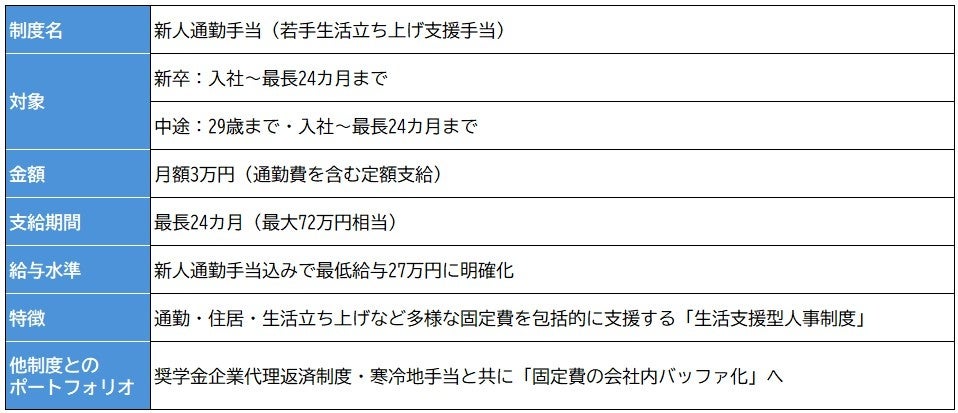 — 通勤費を含む「若手生活立ち上げ支援手当」を2025年6月より運用開始。新卒入社2年目までの社員と中途29歳までに月額3万円を支給し、最低給与27万円を実現。 —