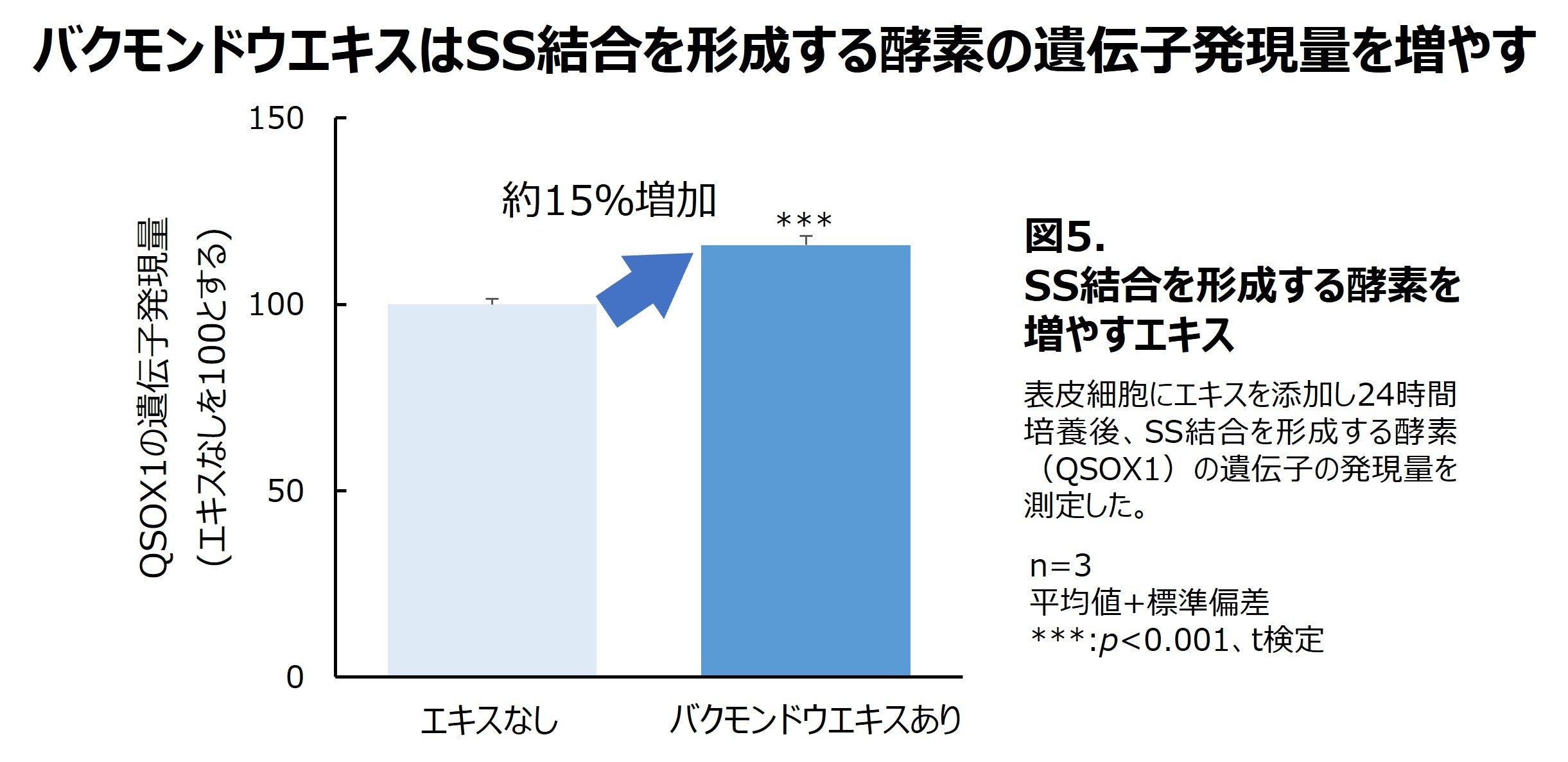 SS結合を形成する酵素を増やすエキスの探索を行った結果、バクモンドウエキスによって、表皮細胞のSS結合を形成する酵素の遺伝子発現量が増えることが明らかとなりました(図5)。この遺伝子の発現量が増加することで、SS結合を形成する酵素の産生量も増加すると考えられます。