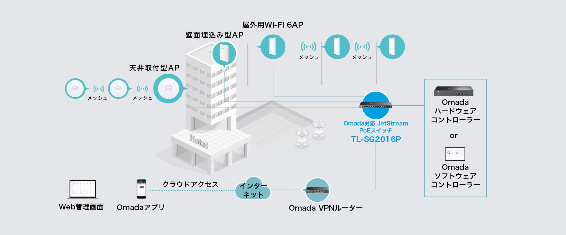 さらに、TP-Linkが提供するクラウドソリューション「Omada SDN Solution」に対応しているため、Webブラウザを経由したOmadaクラウドアクセスや専用アプリからの一括管理が可能。オフィス・宿泊施設等へ拡張性の高いネットワーク構築を提供します。