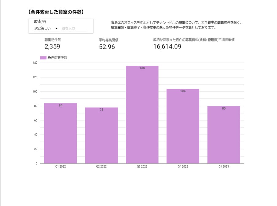 最後のグラフは、賃貸条件の変更をした貸室件数の推移を表現しています。2022年第3四半期までは条件変更件数が増えていましたが、以降は2023年第1四半期に至るまで条件変更の減少し続けています。