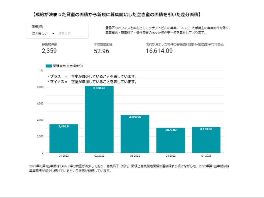 下のグラフは、成約が決まった貸室の面積と新規に募集開始した空き室面積の差分面積を表現しています。豊島区に関しては差が埋まりつつあるものの、どの期間も成約物件面積が空き室面積を上回っていることから、市場全体として空き室の面積が減少していることがうかがえます。