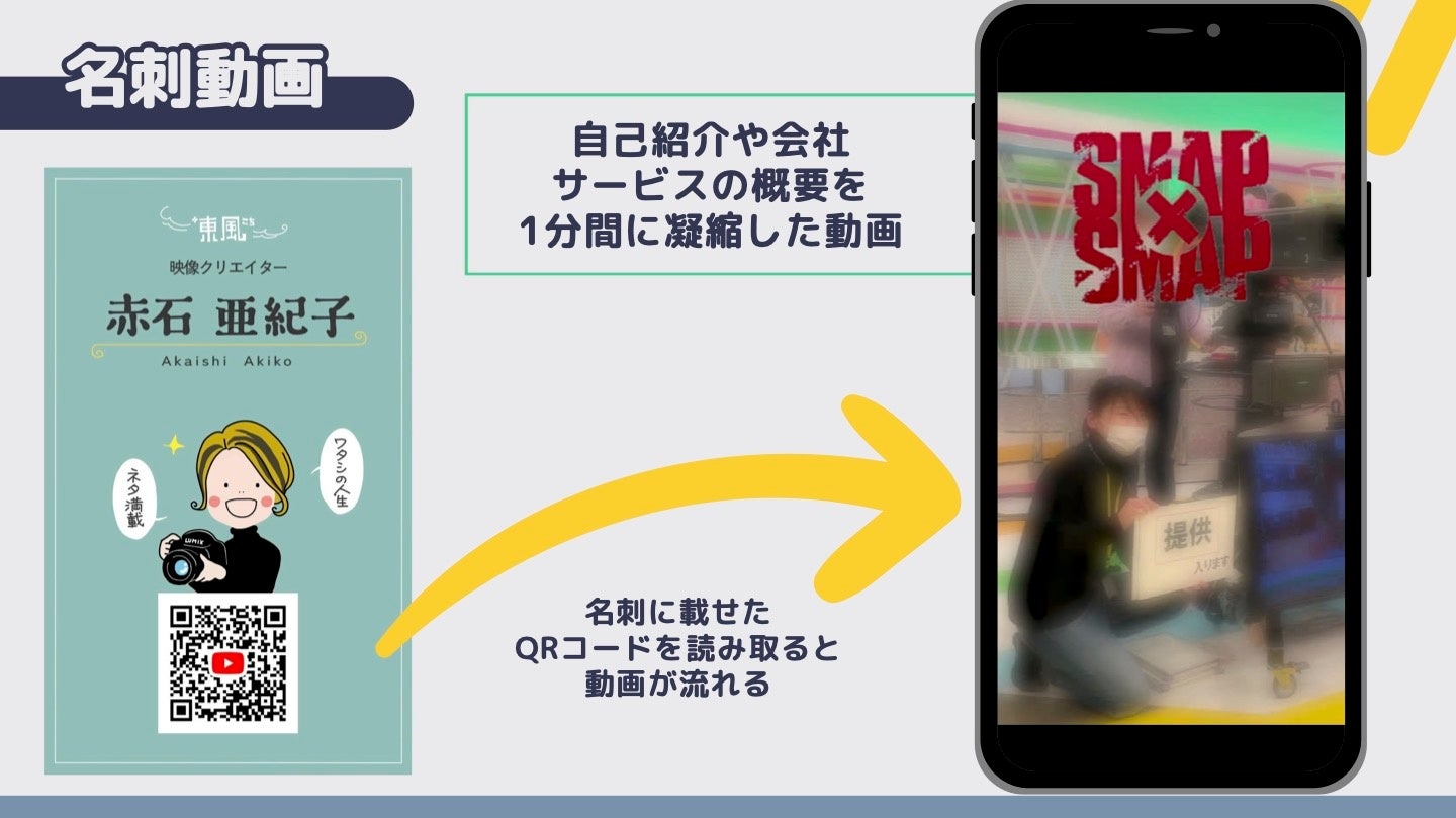 名刺にQRコードを添えることで、スマートフォンで瞬時に動画を視聴することができるので、顔と名前を憶えてもらいやすくなります。