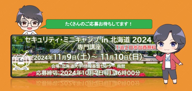 2024年11月9日(土)〜11月10日(日)一般社団法人LOCAL、 北海道大学情報基盤センター サイバーセキュリティセンター、一般社団法人セュリティ・キャンプ協議会、独立行政法人情報処理推進機構(IPA)が主催する「セキュリティ・ミニキャンプ in 北海道 2024」の専門講座への参加者を募集いたします。当キャンプは全国各地で専門講義を行い、情報セキュリティの人材発掘と育成を目的としています。通常は毎年8月に開催される全国大会に比べ、講義期間は1日から2日ほど短いため、「ミニキャンプ」とも呼ばれています。今回は北海道で、25歳以下の学生を対象に専門講義を行います。