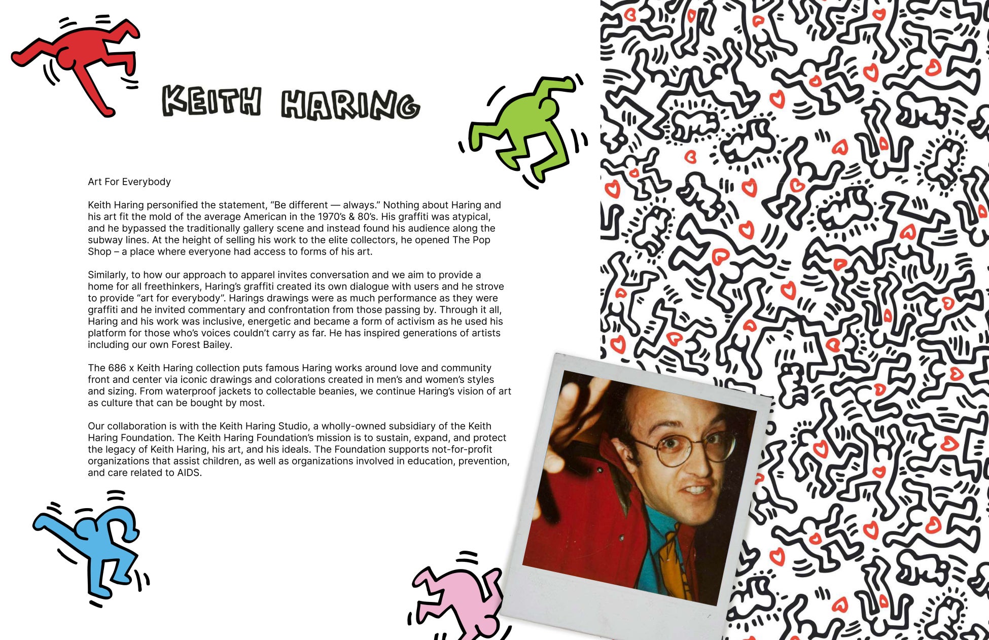 ストリートアートの先駆者として知られ、ニューヨークの地下鉄に描いたグラフィティがきっかけで1980年代のアメリカを代表するアート作家の地位を築いたKEITH HARING。シンプルなラインと大胆な色で構成されている彼の作風を686のアイテムに落とし込みました。
