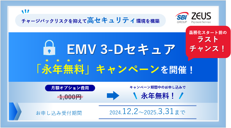 【内容】 | キャンペーン期間中に「EMV 3-Dセキュア」にお申し込みされたお客様につきまして、「EMV 3-Dセキュア」オプションの月額費用1,000円を永年無料で提供いたします。 |
