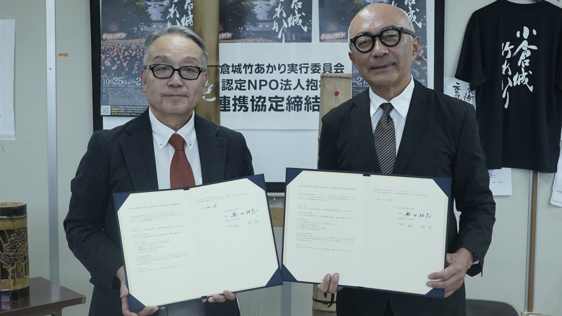 このたび、小倉城竹あかり実行委員会(以下、実行委員会)と NPO 法人抱樸(以下、抱樸)は、まちづくりに関して連携・協力することを通じて地域社会の発展に寄与することを目指し、2024年10月15日、コクラボ(北九州市小倉北区東港)にて、包括連携協定を締結しました。