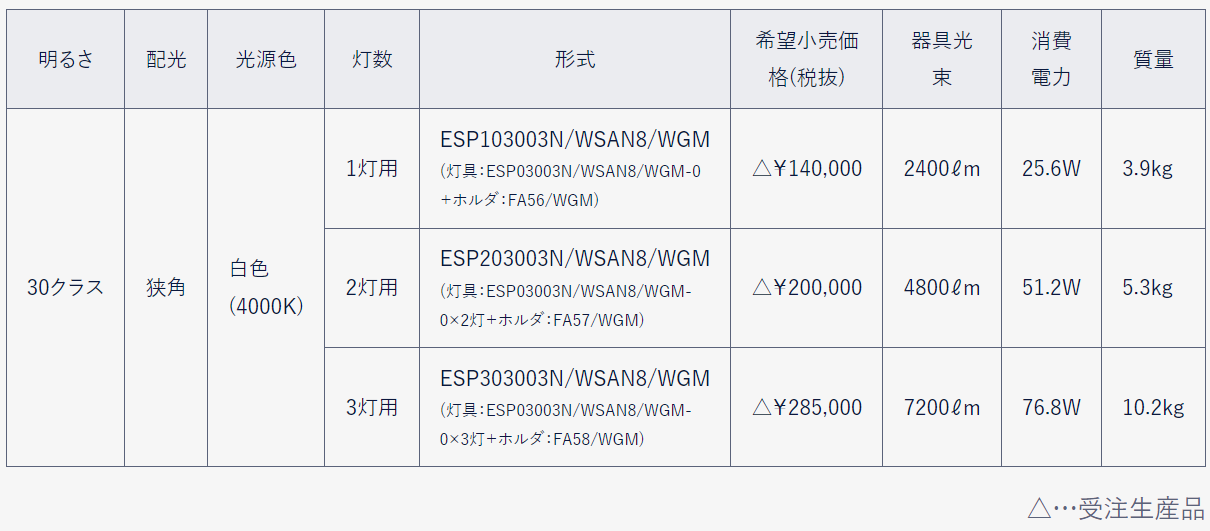 灯具の明るさは3クラス、光源色は白色(4000K)と電球色(2700K)の2色、配光は狭角・中角の2種類。