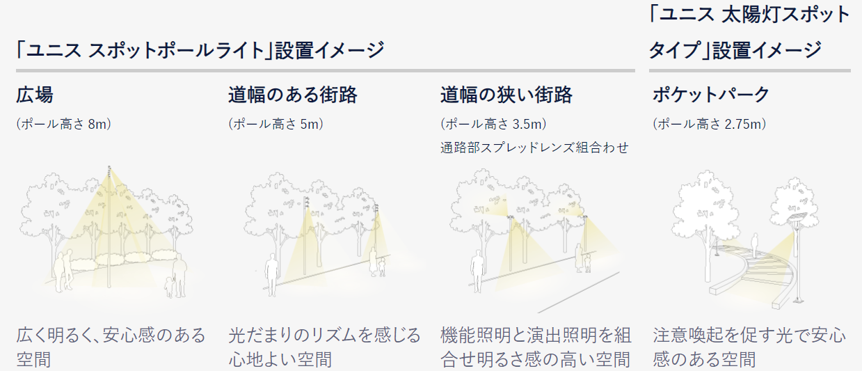 「unis」シリーズは、多彩な光の組合せと景観の調和による新たな光環境の提供で、人に寄り添い、心地よさを感じる屋外空間づくりに貢献するためにラインアップの拡充を継続的に実施する予定です。