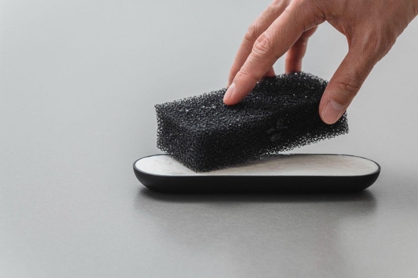 固形洗剤、スポンジ(2個入り)、水切りマット、クロス。食器洗いを「お手入れ」へ変えるための4つのアイテムをセットにしました。