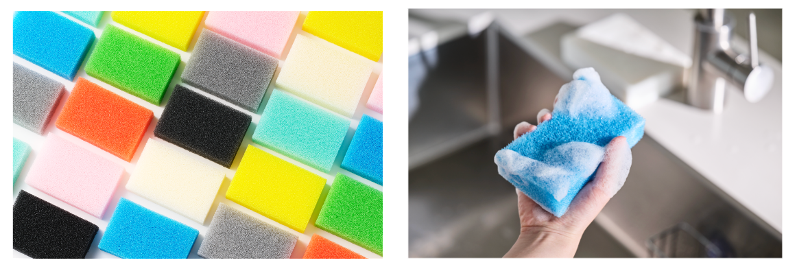 ダイニチ・コーポレーションは創業から、食器洗い用固形洗剤の製造販売を行っています。製造から販売を行う中で、固形洗剤と相性の良いスポンジを研究し、高品質ポリウレタンを使用した、従来のスポンジの概念を覆す「サンサンスポンジ」が生まれました。半年以上使えるほど丈夫で長持ちなので、ごみの削減に。