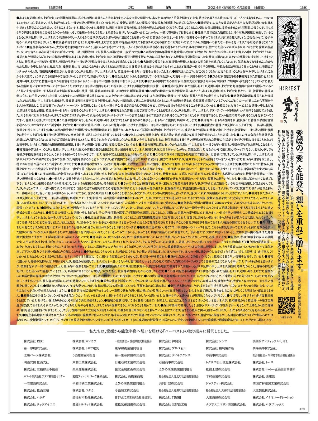 『ハーベスト』能登半島地震被災地支援プロジェクトへのご賛同により、「北國新聞」の全面広告にメッセージを掲載するとともに、愛媛県産品が選べるギフトカードを被災地にお届けしました。