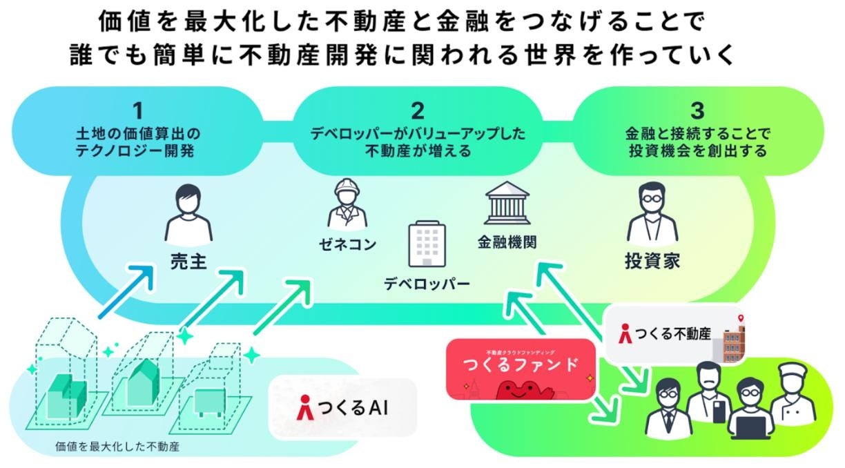 「すべてのまちと、まちをつくる人たちのために」というミッションのもと、不動産、建築、金融の3つの分野を融合させ、これまでの業界が抱える課題を根本から解決するデジタルインフラの構築を目指しています。