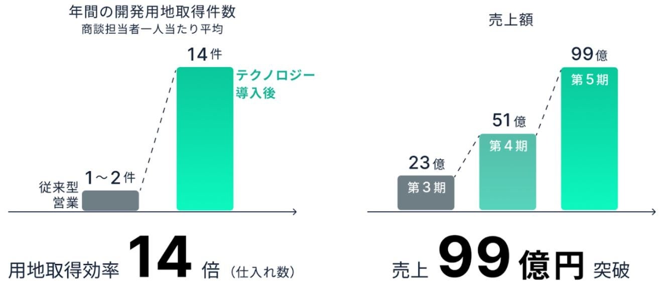 結果的に用地取得効率は従来の14倍に向上、仕入れ数の増加とともに売上は99億円を超えました。さらに、自社開発のテクノロジーをSaaSプロダクトとして提供し、不動産開発業界の変革にも挑戦しています。