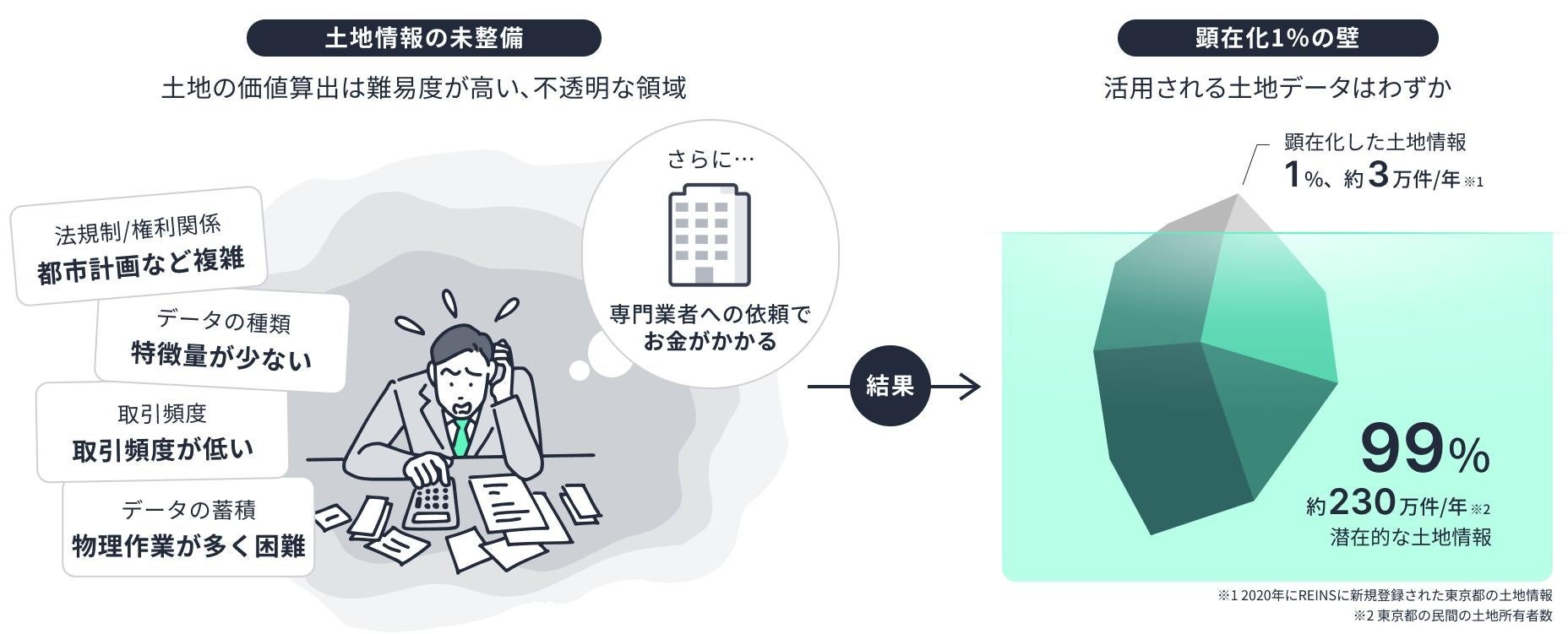 不動産は土地と建物から成り立っていますが、特に土地の価値を算出することは難しく、時間とコストがかかるため、これが大きなボトルネックとなっています。さらに小規模な不動産においては、土地の価値の算定に必要な調査費用がROI(投資利益率)に見合わない場合が多く、土地情報のデータ化が進んでいないのが現状です。