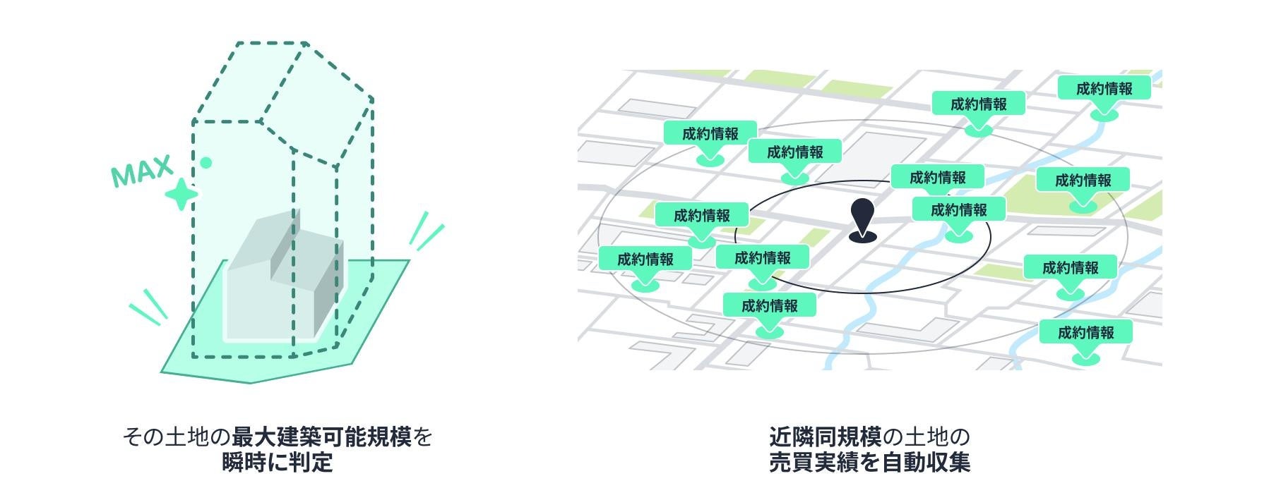 このテクノロジーを活用することにより、土地の基本情報を入力するだけで、都市計画や条例を反映させた上で、その土地に建てられる最大規模の建物データを自動生成することが可能になりました。さらに、この建物データに加え、周辺エリアにおける同規模の物件成約状況や路線価情報なども自動収集できるシステムを構築することで、その土地が持つポテンシャルをデータ化することに成功しました。