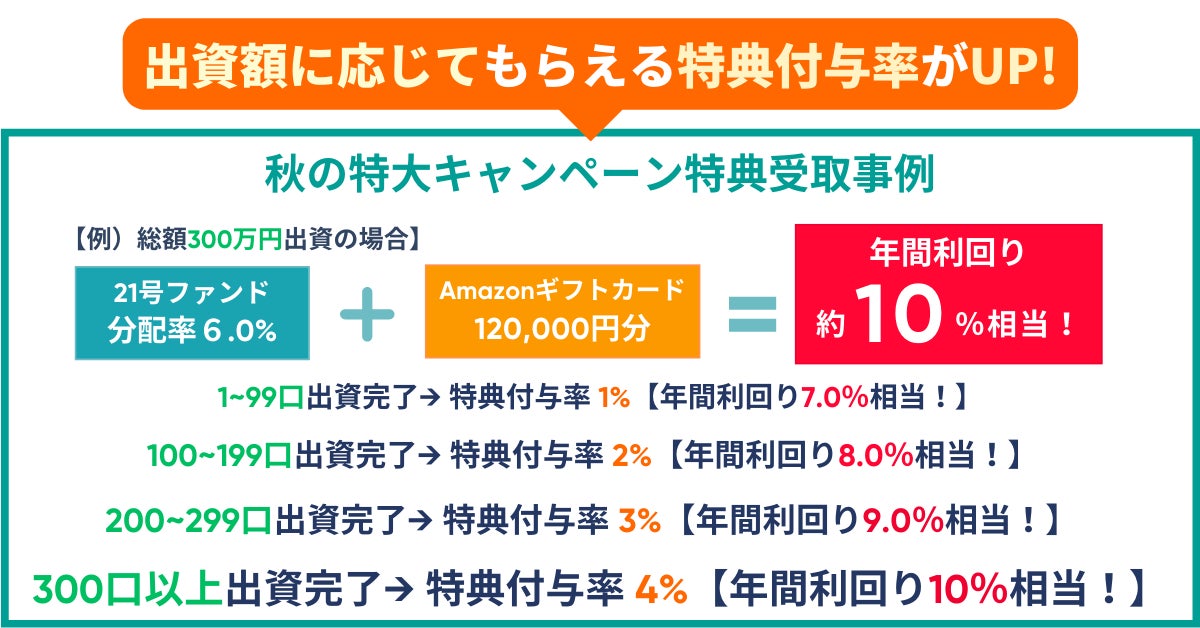21号ファンドの分配率6.0%+秋の特大キャンペーンで最大10%の分配率のチャンス!