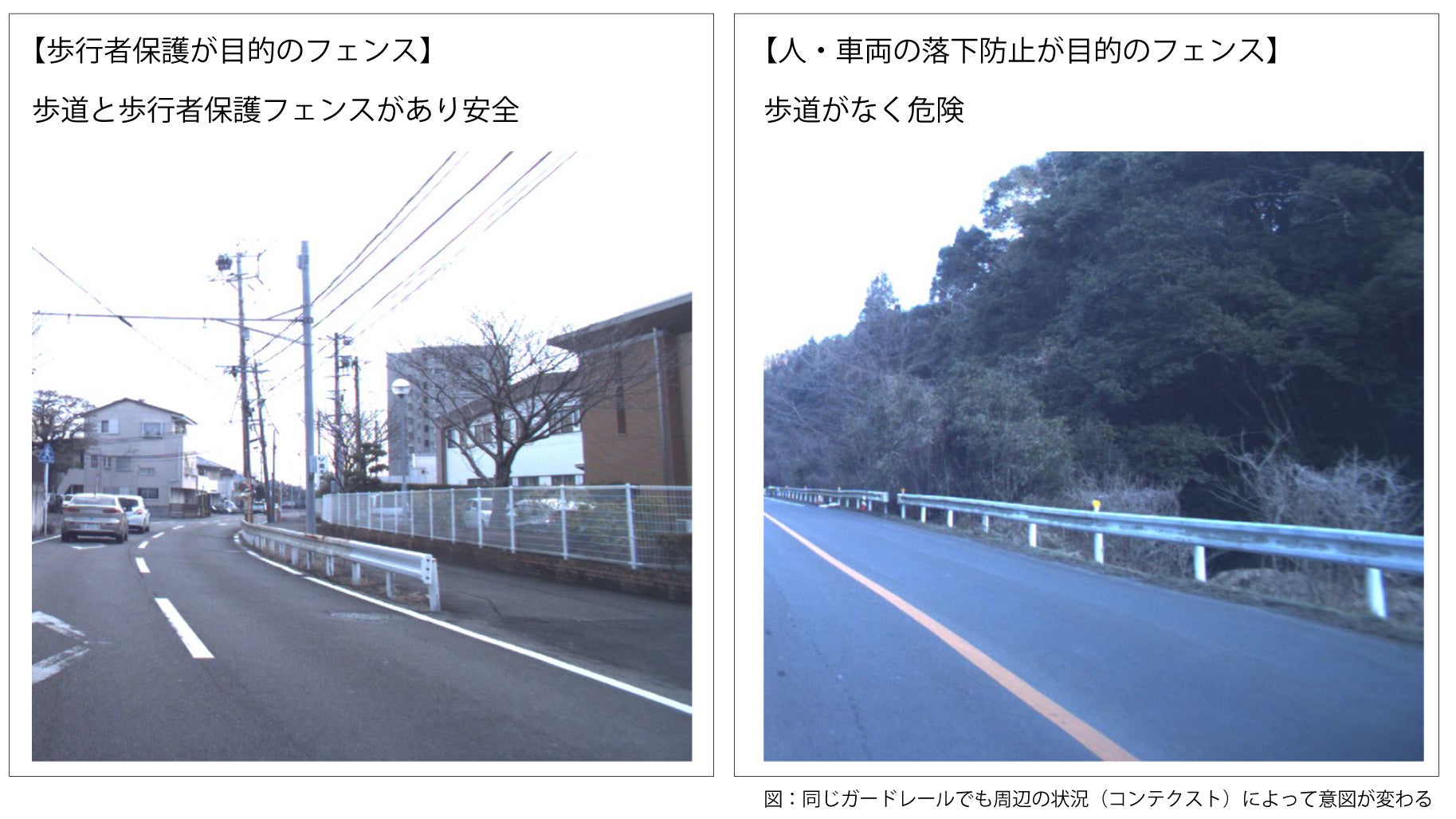 AI開発において、「コンテクスト理解*」という大きな懸念がありました。AIによる画像認識の目的は、歩行者の視点から見た安全性を評価することです。単にフェンスやガードレールを認識する処理とは異なり、歩行者保護を目的としたフェンスなのか、車両や人の落下防止を目的としたフェンスなのか、は周囲の状況を認識して識別する必要があります。