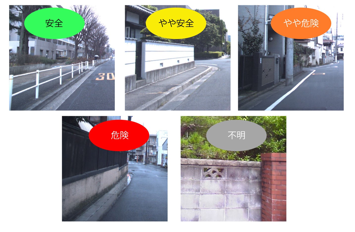 この識別結果と撮影時の位置情報から地図上に歩道の安全性をプロットした地図を作成することも可能です。(図:都心の歩道の安全性評価マップを参照)