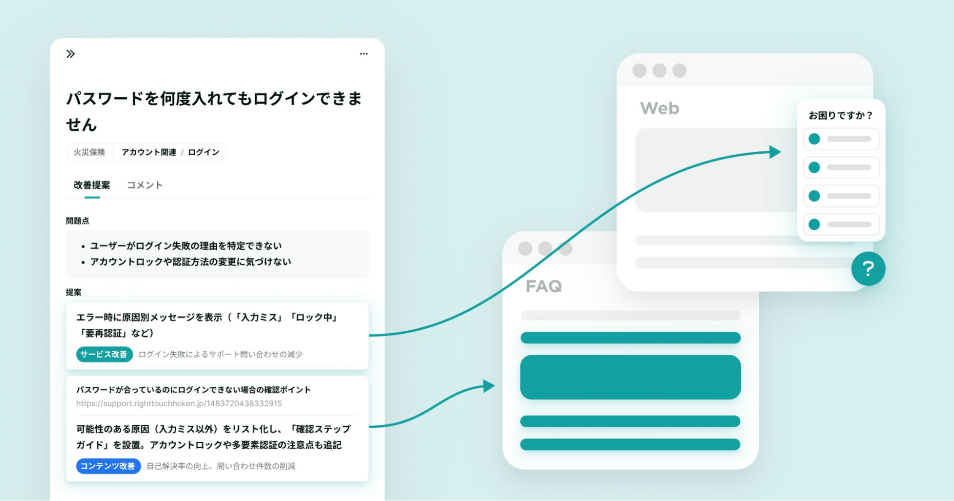 生成AIが抽出した課題をもとに、FAQの改善が自動で提案されます。不足しているFAQの追加や修正、有効な施策一覧が自動で生成されるため、分析から実際の活用まで落とし込むことができ迅速な改善ができるようになります。