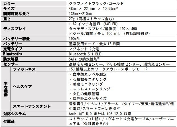 24時間で心拍数、血中酸素レベル測定、ストレスをモニタリングし、各々異常を検知した場合、警告することも可能です。また、科学的な睡眠モニタリングと女性の健康管理機能で総合的な健康管理を実現します。