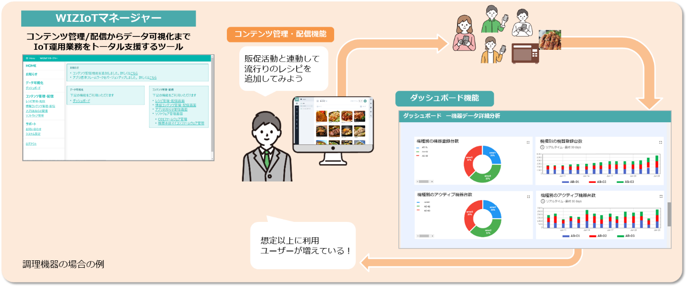コンテンツ管理・配信機能とダッシュボード機能は相互にシームレスなご利用が可能。機器接続台数、アクティブユーザー数など、IoT機器の運用における基本情報に加えて、配信したレシピや運転コースがどのくらいのユーザーに使われているかなどマーケティング施策の効果をダッシュボードで確認することができます。