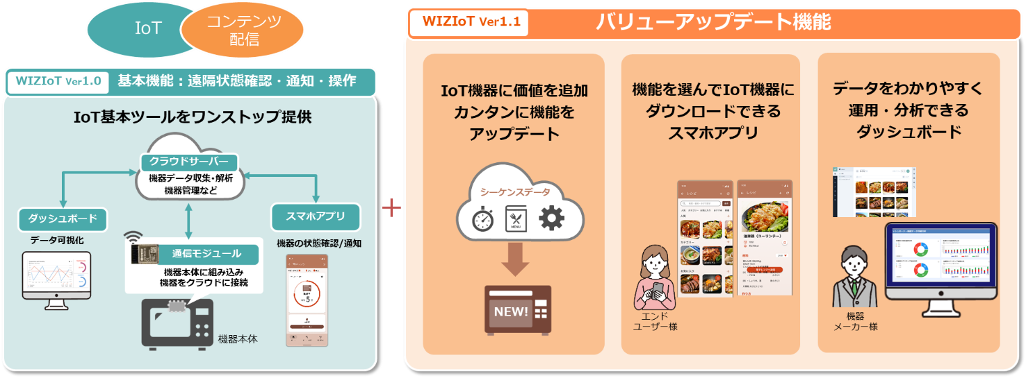 株式会社AIoTクラウド(本社:東京都江東区、代表取締役社長:石黒 豊)は、機器メーカー向けに、IoT製品の開発・運用に必要なクラウド、スマートフォン用アプリケーション(以下、アプリ)、ダッシュボード、通信モジュール※1用ファームウェア、サポートをワンストップで提供するIoT開発運用SaaS『WIZIoT(ウィジオ)』に、新たにレシピ・運転コースなど機器のシーケンス制御を製品発売後に追加できる「バリューアップデート機能」を統合し、3月29日から提供開始します。