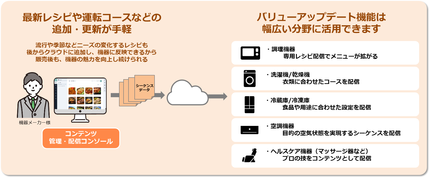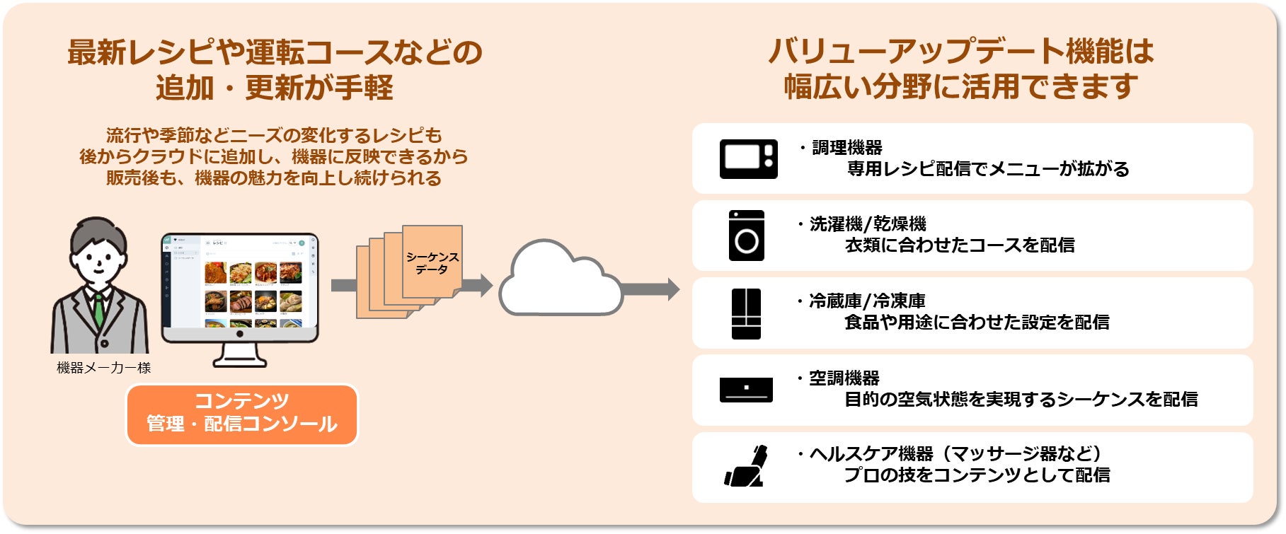 機器メーカーご担当者様が、簡単なUIでレシピデータを登録し、IoT機器アプリ向けに配信できるコンテンツ管理・配信コンソールをご提供。これによって、エンドユーザー様はアプリで多彩なレシピ一覧からお好みのレシピを選んで、最適な調理シーケンスデータを機器にダウンロードして、自動調理を実行いただけるようになります。