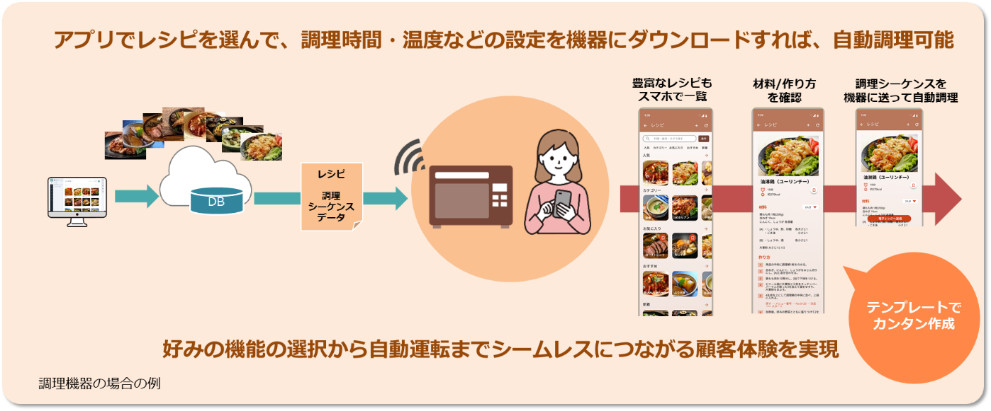 調理機器などのIoT化においては、調理残時間など、機器の運転状況の確認や、完了通知などの基本機能に加えて、レシピと連動した最適制御をカンタンに設定できる機能が求められます。