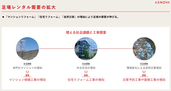 老朽化によるマンションの修繕需要の増加や生活環境の変化によるリフォーム需要の増加、自然災害の増加など、これらの社会的課題に対して、当社が環境負荷の少ない足場のレンタルビジネスで課題を解決することにより、循環型社会の実現を目指していきたいと考えております。