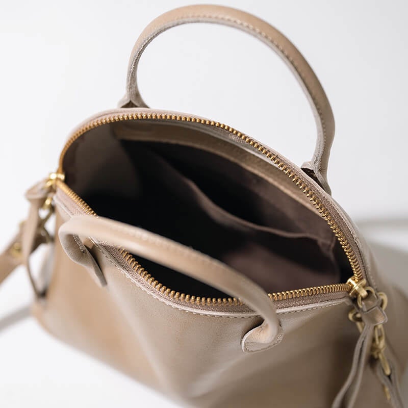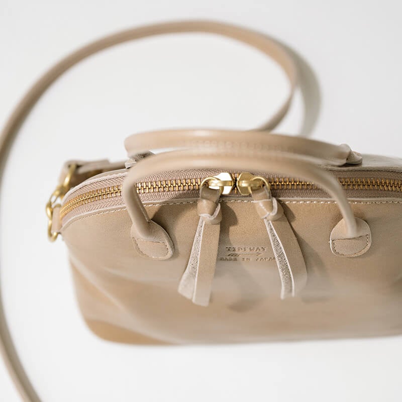 ファスナー部分のレザー使いと、すっきりさりげなく施された刻印がアクセントになっています。どこかレトロな雰囲気も感じさせる丸みのあるフォルムは、幅広いテイストのコーデに似合います。