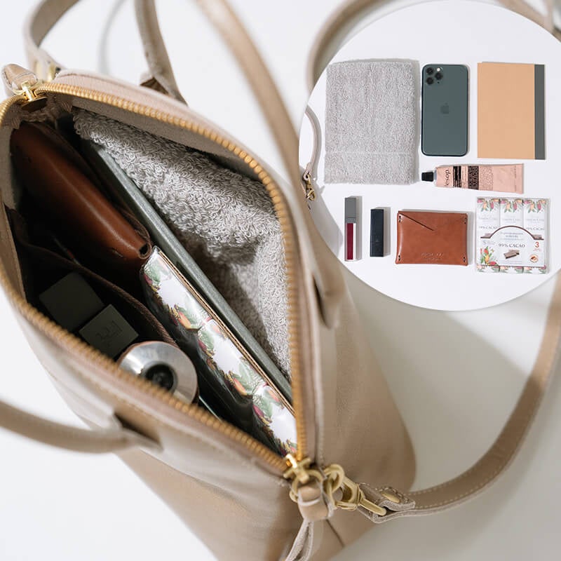 スマホや小さめのお財布、ハンカチなど、必需品を収められるサイズ感。ワンマイルバッグとしても活躍します。