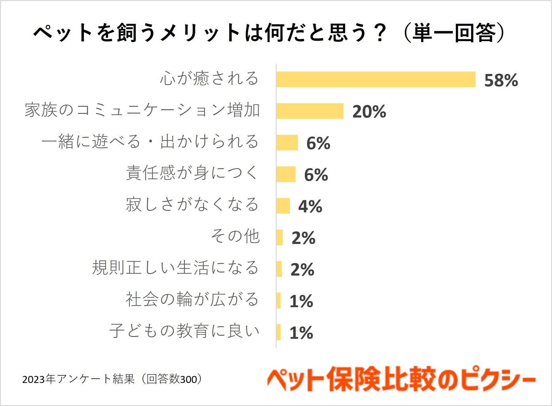 飼い主さまの考えるペットを飼うメリットは、「心が癒される」が58%で1位となり、ほかの回答を大きく引き離しました。