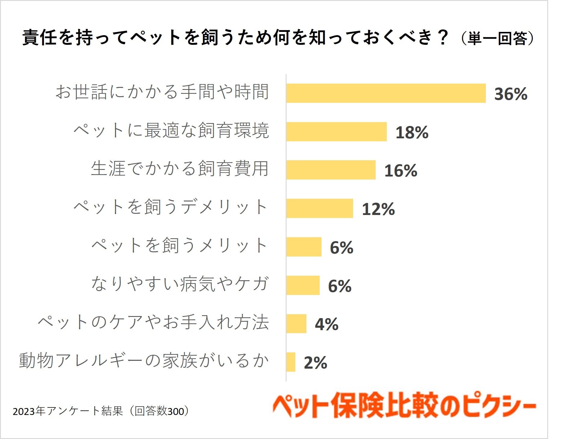 ペットを飼うにあたって、知っておかなければならないことは何でしょうか。責任を持って飼うために知っておくべきことは何かと質問したところ、「お世話にかかる手間や時間」が1位で、36%という結果となりました。
