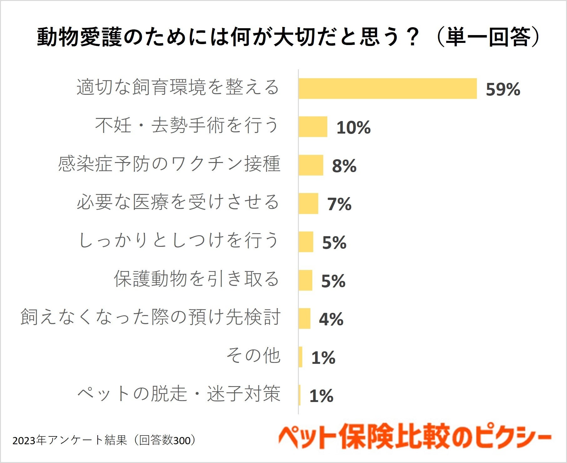 続いて3位は「感染症予防のワクチン接種(8%)」、4位は「必要な医療を受けさせる(7%)」と、ペットの医療に関する回答が並びました。