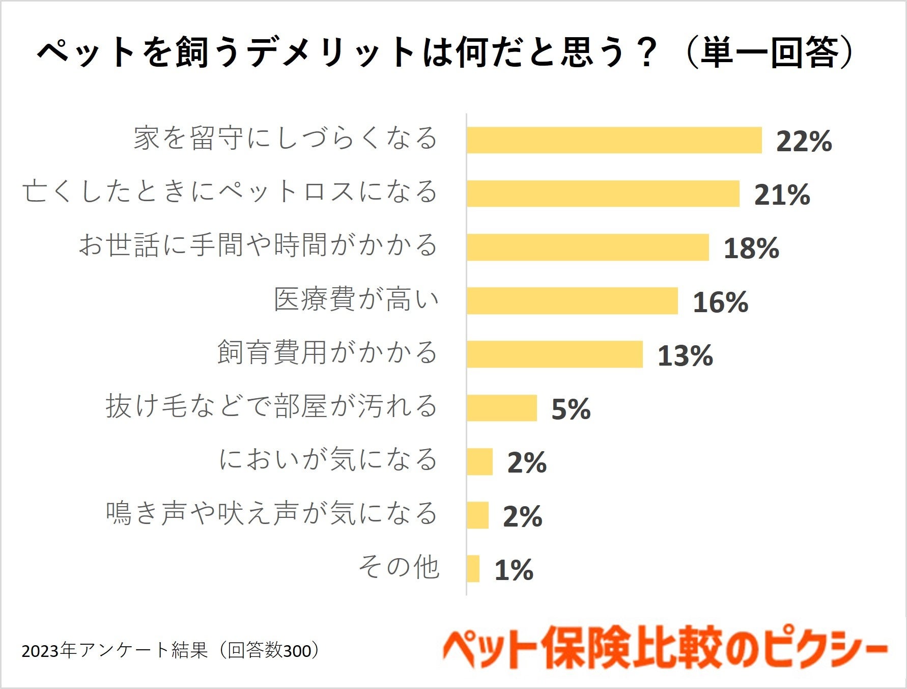 ペットを飼うデメリットは何かと聞いたところ、結果は「家を留守にしづらくなる」という答えが1位で22%でした。長時間の留守番がストレスにつながる場合もあるため、ペットと過ごす時間を大事にしている飼い主さまが多いのかもしれません。