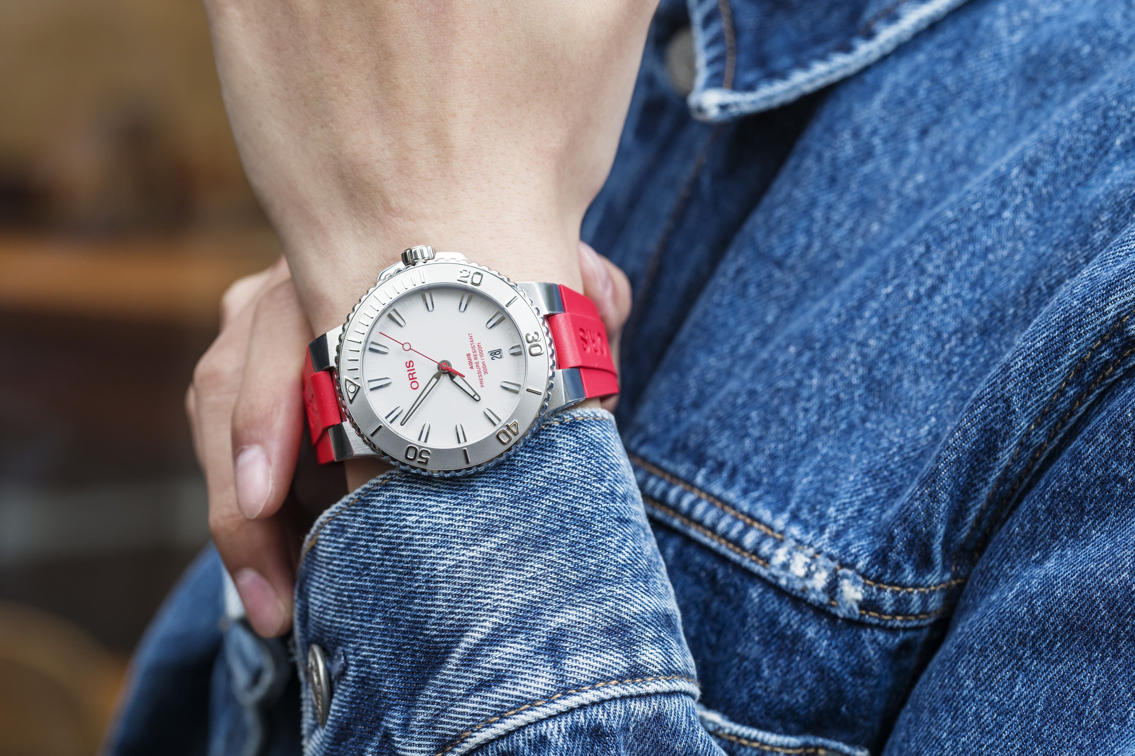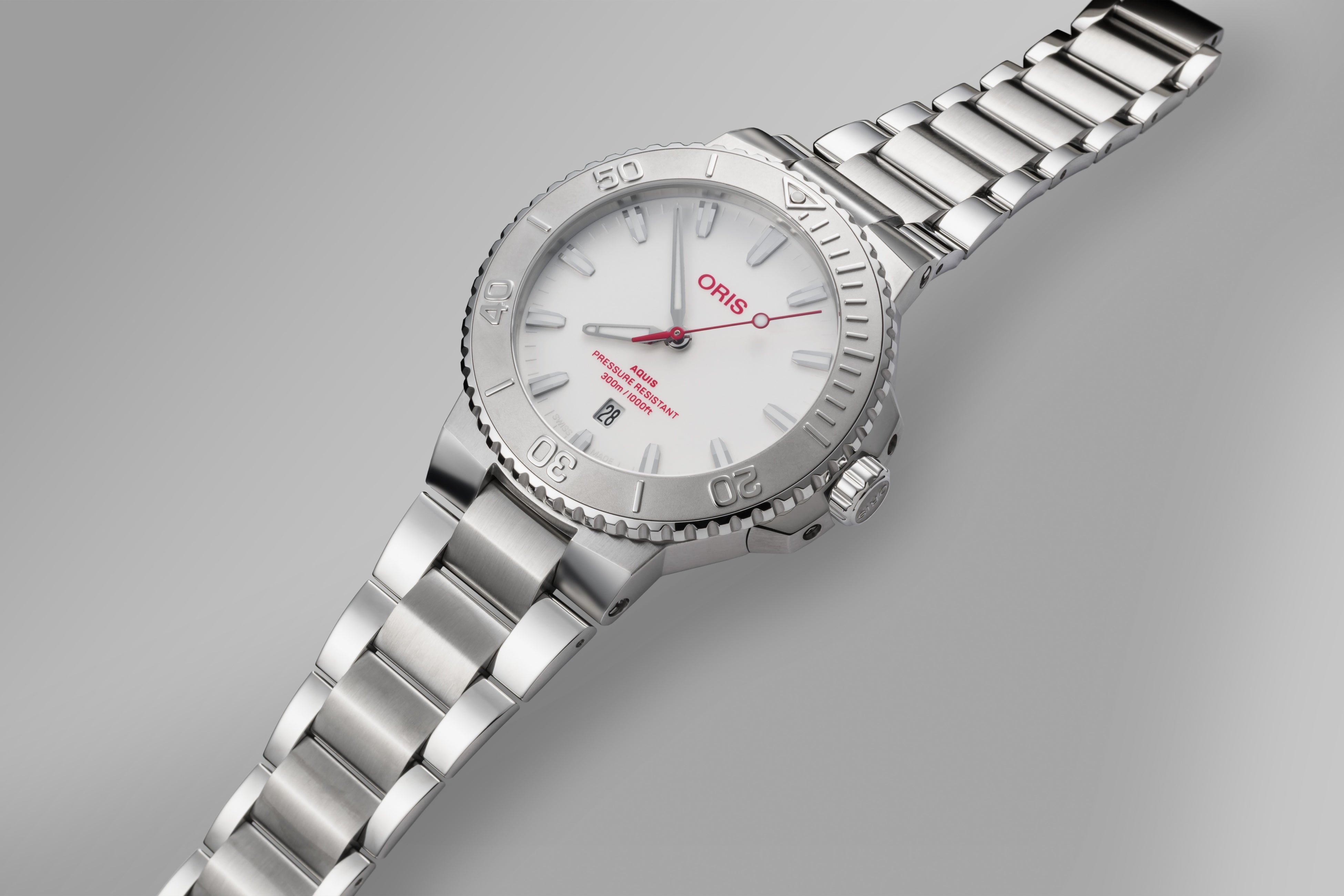 オリスの中でもベストセラーのアクイスコレクション。中でも日本で特に人気の「アクイス デイト レリーフ」をベースにした日本限定モデルは、洗練されたホワイトダイヤルに鮮やかなレッドのロゴと秒針を配置した美しいデザインを特徴とします。